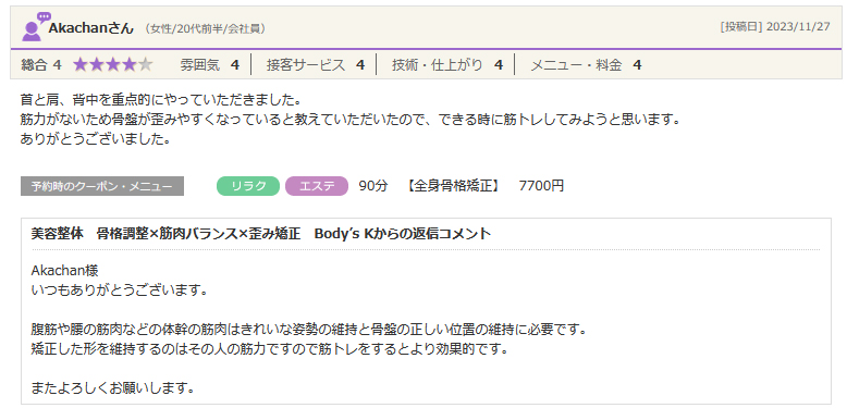 ホットペッパービューティーより口コミをいただきました