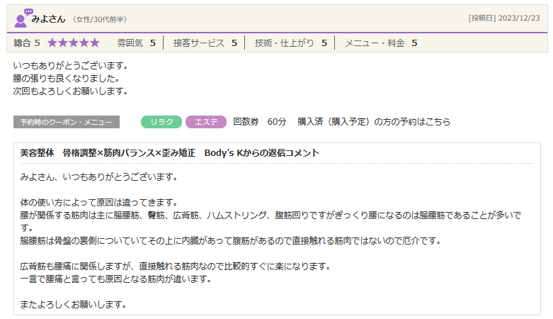 広背筋も腰痛に関係しますが、直接触れる筋肉なので比較的すぐに楽になります。
