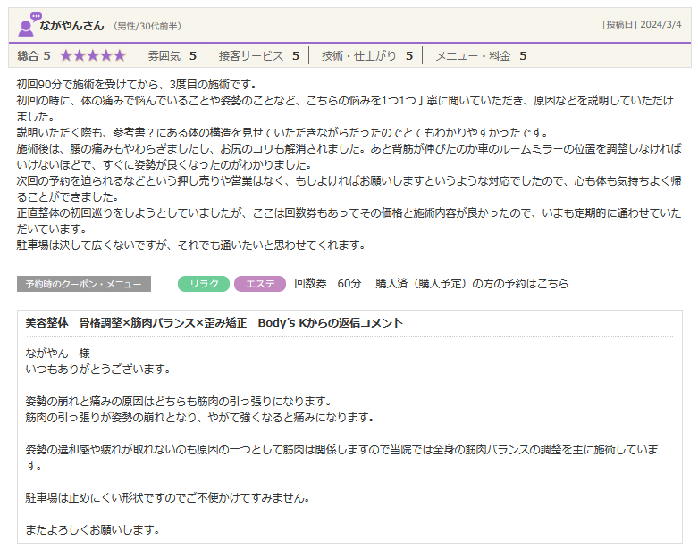 正直整体の初回巡りをしようとしていましたが、ここは回数券もあってその価格と施術内容が良かったので、いまも定期的に通わせていただいています。